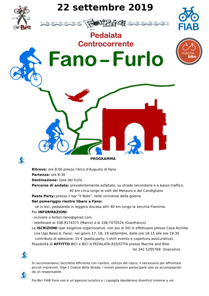 For.Bìci FIAB di Fano, nell’ambito della Settimana Europea della Mobilità Sostenibile, organizza per domenica 22 settembre 2019 la “Pedalata Controcorrente” Fano – Furlo.
