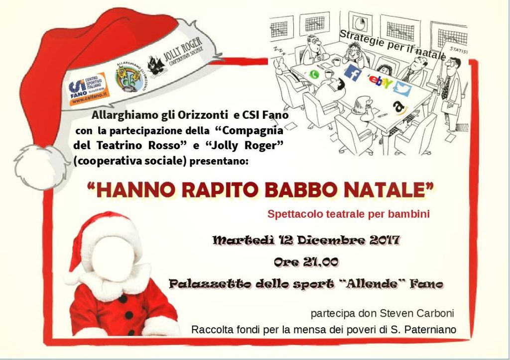 ‘Hanno rapito Babbo Natale’ è il titolo dello spettacolo teatrale per bambini e adulti che celebrerà il momento dello scambio di auguri del Csi Fano. La simpatica iniziativa, con tanto di lettera di riscatto dei rapitori, è organizzata dall’associazione Allarghiamo gli Orizzonti di Fano, associazione affiliata al Csi Pesaro-Urbino dal 2005.