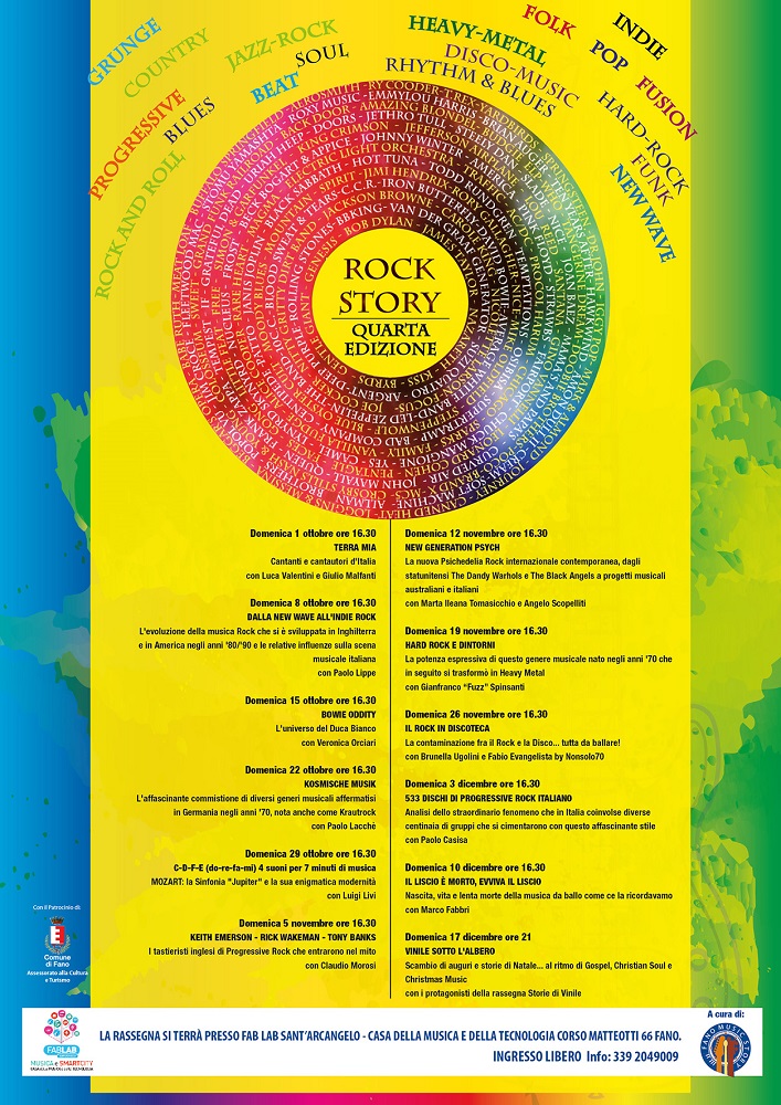 Dal 1 ottobre al 17 dicembre si terrà la quarta edizione di Rock Story, rassegna dell’Associazione Culturale “Fano Music Story” in cui si trattano diversi argomenti musicali. Attraverso ben 12 appuntamenti settimanali (ogni domenica pomeriggio alle 16.30 alla Casa della Musica di Fano) si approfondiranno i più vari stili e generi, dal rock alla musica classica, dalla canzone d’autore alla new wave, dal progressive alla musica da ballo.