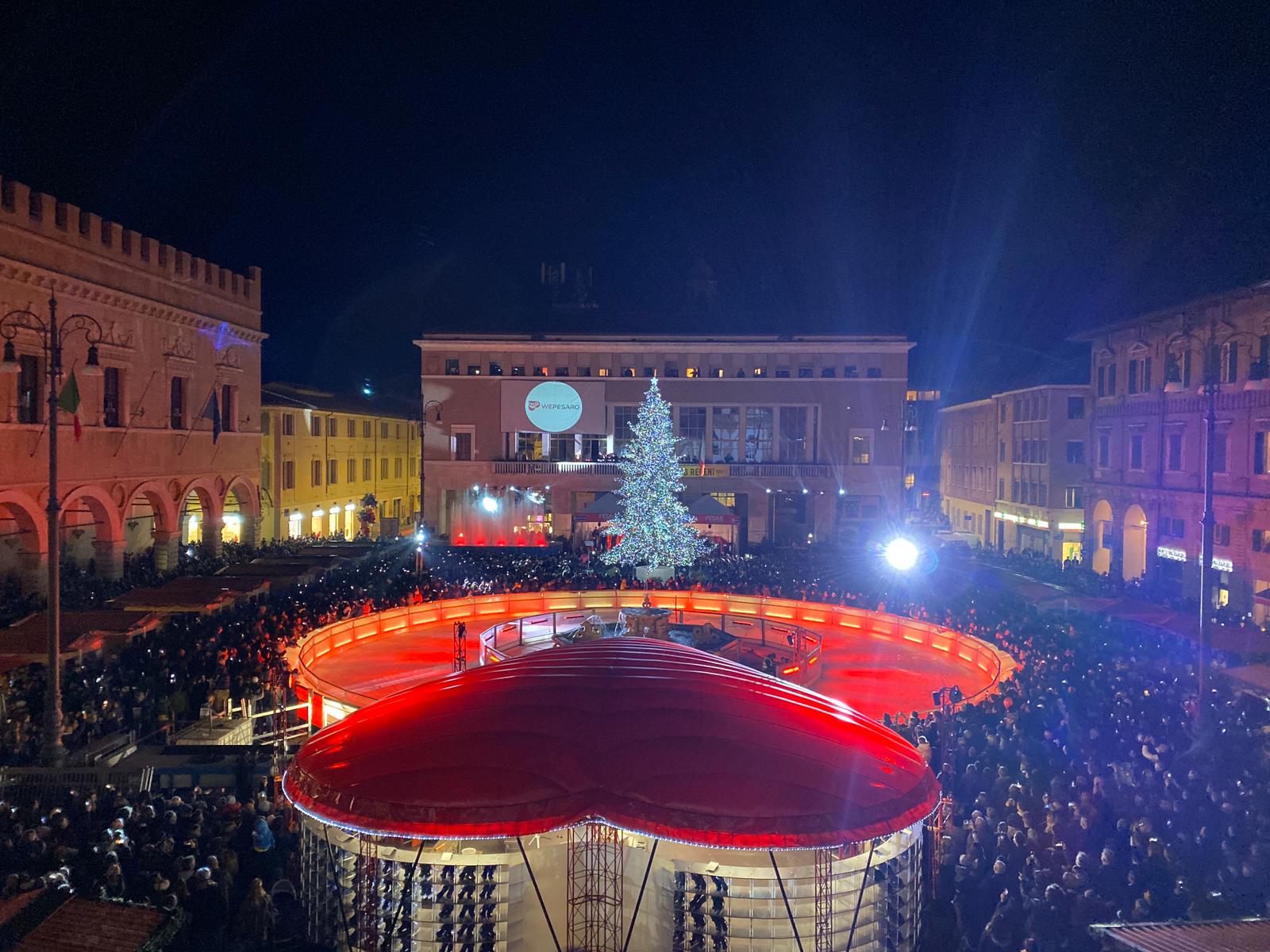 Show di luci, giochi d’acqua, musica e coriandoli per l’accensione dell’albero in piazza del Popolo a Pesaro.