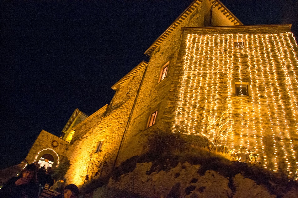 Il percorso inizia da piazza del Municipio, dove i visitatori aspetteranno l’arrivo della navetta sotto il maestoso albero di Natale. La salita è affascinante perché il bel panorama è dominato dal Castello nella sua atmosfera ovattata. Appena scesi, il borgo medievale, con la sua pietra calcarea, colpirà da subito i turisti. Ad accoglierli, all’ingresso del Castello, il Cavallo dell’artista Dall’Osso, una scultura in ferro e fili di rame che con la sua criniera al vento saluta il massiccio del Catria dove si trovano gli impianti scioviari raggiungibili grazie ad una comoda telecabina. Il Castello è una splendida struttura dell’anno mille, già di proprietà dei Montefeltro prima e dei Della Porta poi, impreziosita dal puntone di eco Martiniano ed utilizzata per mostre, convegni, concerti e banchetti di matrimonio.