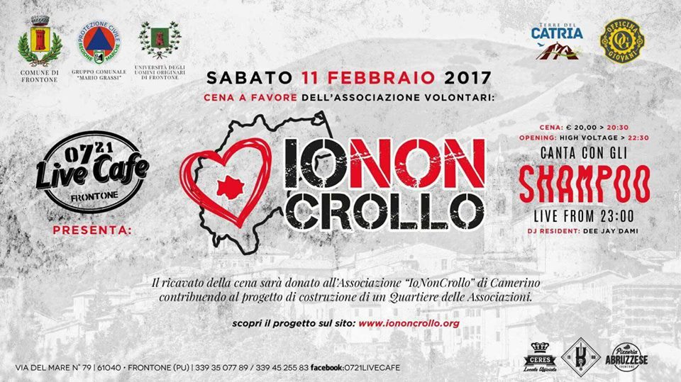 Sabato sera ci sarà la cena, il cui ricavato sarà completamente devoluto a IoNonCrollo, poi la musica degli High Voltage, giovanissima band laurentina, degli Shampoo e di DJ Dami.