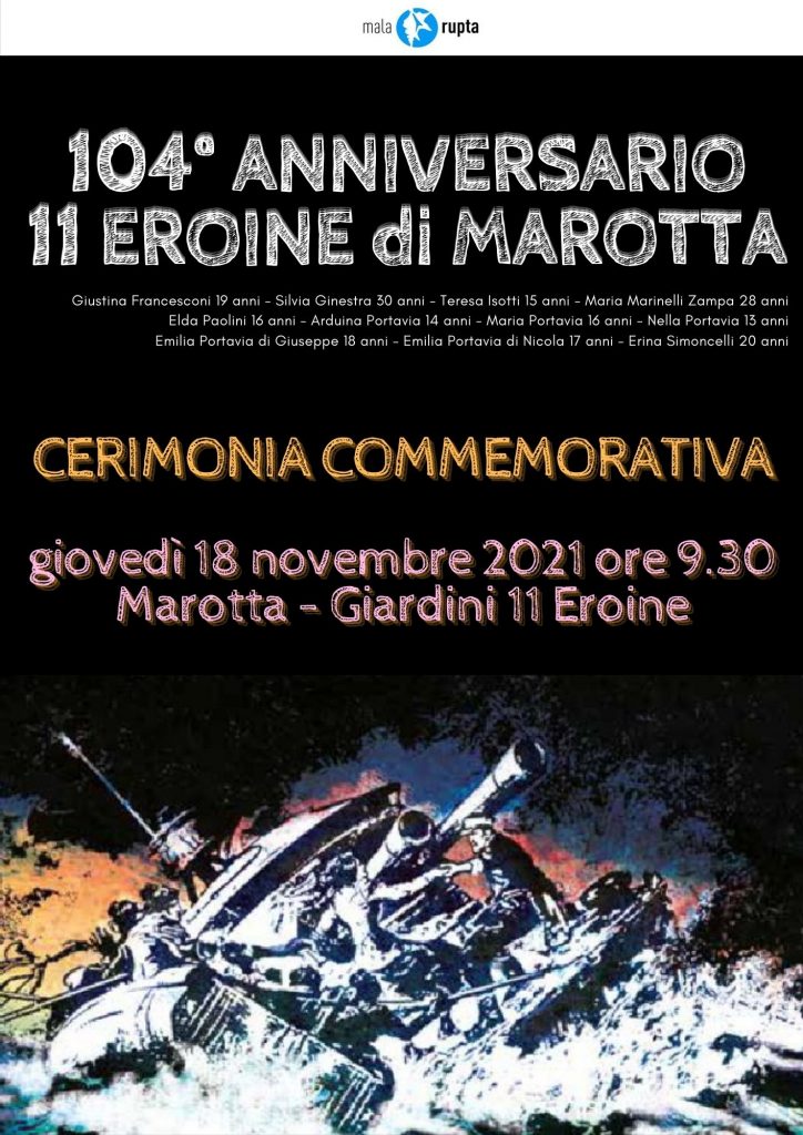 Giovedì 18 novembre 2021, a partire dalle ore 9.30, nel Giardino Le 11 Eroine, sul lungomare marottese avrà luogo la commemorazione per il 104esimo anniversario delle 11 Eroine di Marotta. L’Associazione Malarupta, in collaborazione con il Comune di Mondolfo e la Capitaneria di Porto – Guardia Costiera, rende omaggio alle eroine.