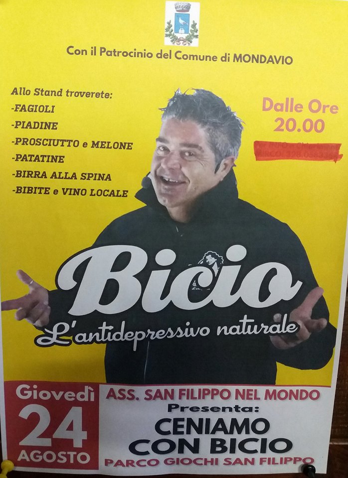 Divertimento assicurato giovedì 24 agosto al parco giochi di san Filippo con Bicio: l’antidepressivo naturale. Tante risate e cena con fagioli, padiene, prosciutto e melone, patatine, tagliatelle. L’appuntamento è dalle ore 20.