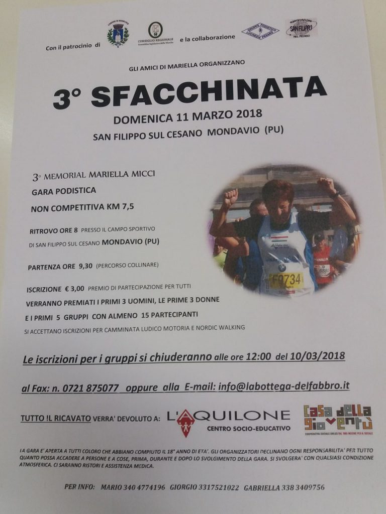 La gara podistica non competitiva è di 7,5 km. Ritrovo alle 8 presso il campo sportivo di San Filippo sul Cesano. Partenza alle 9.30. Le iscrizioni per i gruppi si chiuderanno alle 12 di sabato 10 al fax 0721.875077 o mail info@labottega-delfabbro.it.