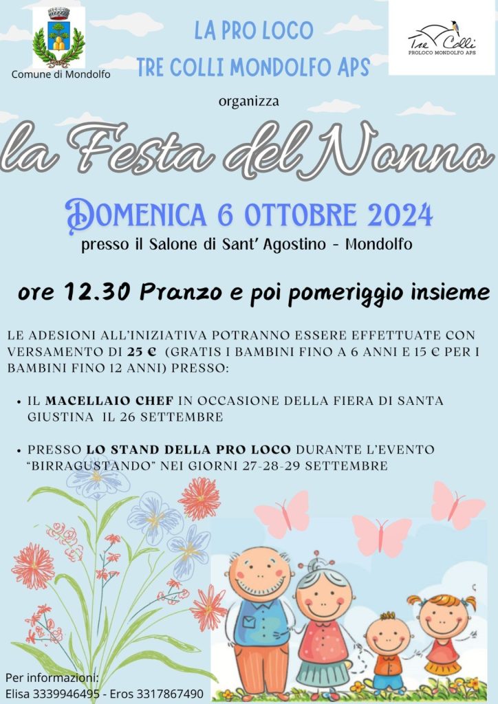 “Un nonno è qualcuno con l’argento nei capelli e l’oro nel cuore”. In occasione della Festa dei nonni che si celebra mercoledì 2 ottobre, torna anche quest’anno la giornata dedicata ai nonni, organizzata dalla pro loco Tre Colli di Mondolfo.
