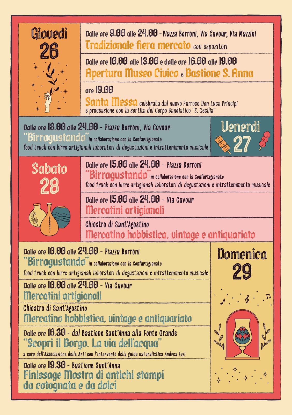 La fiera mercato di Santa Giustina si svolgerà il 26 settembre dalle ore 9 alle 24 in piazza Borroni, in via Cavour e via Mazzini, mentre nei giorni seguenti, sempre in piazza Borroni e per le vie del centro storico, la Pro Loco Tre Colli di Mondolfo parteciperà a Birragustando (venerdì 27 dalle ore 18 alle 24, sabato 28 dalle ore 15 alle 24, domenica 29 dalle ore 10 alle 24) con stand gastronomici con street food locale, food truck con birre artigianali e laboratori di degustazione, in collaborazione con Confartigianato.