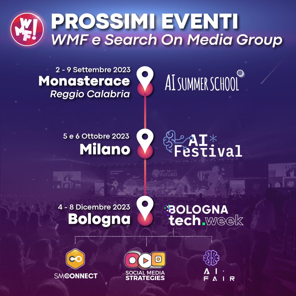 Il WMF, Fiera Internazionale e Festival sull’Innovazione Tecnologica e Digitale, organizzato da Search On Media Group, presenta tre imperdibili appuntamenti nel suo ricco calendario di eventi formativi: l’AI Summer School, l’AI Festival e la Bologna Tech Week, che si inseriscono tra le numerose attività di “WMF FOR AI”, l’insieme di iniziative promosse e organizzate da WMF sin dal 2016 e volte a diffondere cultura e formazione sull’Intelligenza Artificiale.