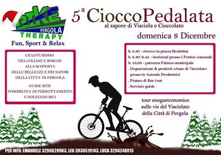 Una pedalata al sapore di visciolato e cioccolato in una cornice da favola, all’insegna dell’attività fisica, della bellezza, del gusto e della promozione del territorio. Domenica 8 dicembre, in occasione della CioccoVisciola di Natale, la festa della cioccolata e del visciolato, è in programma la quinta CioccoPedalata, promossa dall’Asd Bike Therapy. Una cicloturistica, un tour enogastronomico sulle strade del Visciolato di Pergola, pedalando lungo le vie di uno dei borghi più belli d’Italia e le suggestive colline che circondano la città. Una mattinata alla scoperta delle bellezze e dei sapori di un territorio dalle tante eccellenze enogastronomiche e storico-artistiche. Lungo il percorso, i partecipanti potranno degustare prodotti tipici e tante specialità presso le aziende produttrici, pedalando con gusto!