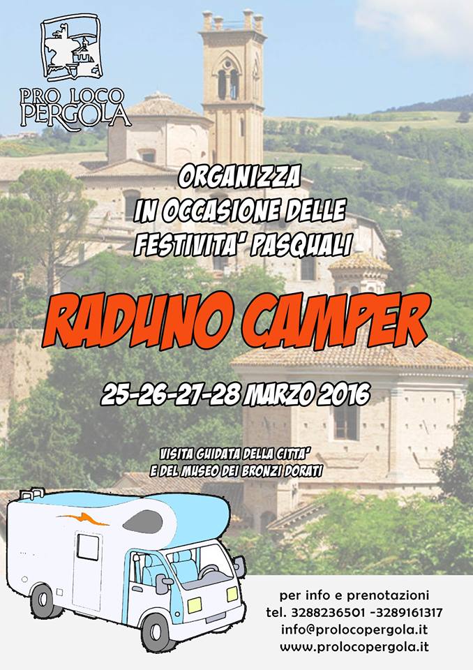 Pergola sempre più città amica del turismo itinerante. Dopo il successo dei raduni camper in occasione della Fiera Nazionale del Tartufo e della CioccoVisciola di Natale, l’attivissima Pro Loco organizza un nuovo appuntamento dedicato ai camperisti per Pasqua. Il raduno è in programma il 25, 26, 27 e 28 marzo. In occasione delle festività pasquali la proposta per tutti coloro che viaggiano in camper è quella di trascorrere qualche giorno a Pergola, città immersa nelle colline delle Marche, ricca di fascino, arte e cultura. Pergola si trova in provincia di Pesaro Urbino, a circa 35 km dalla costa Adriatica e vicina al monte Catria.