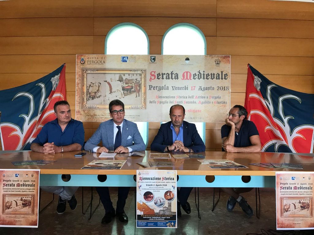 Oltre 250 figuranti, 15 gruppi storici, altrettante amministrazioni comunali, i 2 maestosi buoi direttamente dalla sfilata di piazza del Campo del Palio di Siena: sono questi alcuni dei numeri della decima edizione della Serata Medievale in programma il 17 agosto, presentata ieri nella sede della Confcommercio. La manifestazione rievoca l’arrivo a Pergola delle spoglie dei santi Secondo, Agabito e Giustina. Storia, cultura ma anche promozione del territorio, come ha evidenziato il direttore Amerigo Varotti: «Siamo molto contenti di ospitare questa presentazione che rientra nella collaborazione con il Comune di Pergola, iniziata con la gestione di alcuni servizi museali e che sta proseguendo con tante iniziative, sempre con l’obiettivo di promuovere la città e le sue eccellenze. La Serata Medievale come la Fiera del Tartufo e la CioccoVisciola sono eventi che rivestono una straordinaria importanza anche a livello turistico-promozionale. Pergola sta crescendo e continuerà a farlo. Tanti i progetti: dall’apertura dell’ufficio turistico alla pubblicazione della guida sul museo dei Bronzi dorati. E da settembre partiremo con un ricchissimo tour promozionale in tutto il mondo». Ha proseguito il sindaco Francesco Baldelli: «La Serata Medievale, grazie al successo sempre maggiore che riscuote, diventerà ambasciatrice del nostro territorio con i Bronzi e il tartufo. Riscoprire e valorizzare il passato e la propria storia per guardare al futuro con fiducia. Attraverso questo evento riscopriamo la nostra tradizione millenaria. I nostri scorci medievali e un programma sempre più ricco e di qualità attireranno come ogni anno migliaia di turisti. Quest’anno a fianco dei buoi provenienti dal Palio di Siena, i protagonisti saranno i figuranti del più antico palio d’Italia, quelli della Corte Ducale di Ferrara». E con Ferrara, e quello di Pergola, saranno presenti, tra gli altri, i gruppi storici di Ravenna, Fabriano, Camerino, Jesi, Corinaldo. Alle 17 l’apertura dei mercati medievali e antichi mestieri. Alle 18 il corteggio storico, quindi la santa messa nella cattedrale. Per cena apriranno taverne e cantine: «Saranno serviti menù tipicamente medievali – ha spiegato il ristoratore Stefano Ticchi – ». In serata spettacoli, di arcieri, falconeria, sbandieratori e tanto altro. Ha concluso lo studioso Massimo Bonifazi che con Marco Droghini hanno condotto uno studio commissionato dal Comune sul periodo che viene rievocato: «Riordinando l’archivio storico ci siamo imbattuti in documenti di grande importanza che raccontano gli avvenimenti che vengono rievocati».