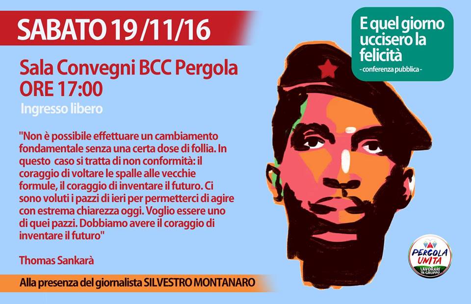 La sala convegni della Bcc, sabato alle 17, ospiterà la conferenza “E quel giorno uccisero la felicità”, con il giornalista e scrittore Silvestro Montanaro. Ad organizzarla l’associazione politico-culturale “Pergola Unita”. Montanaro racconterà Thomas Sankarà, il presidente della felicità, carismatico leader africano che governò il Burkina Faso. Divenne noto per il suo impegno volto a eliminare la povertà del suo popolo, attraverso il taglio degli sprechi statali e la soppressione dei privilegi delle classi agiate. Fu assassinato a soli 38 anni. Silvestro presenterà anche il suo ultimo libro “Col cuore coperto di neve”: un viaggio crudo e diretto nel mondo agghiacciante della prostituzione minorile e dei traffici di carne umana.