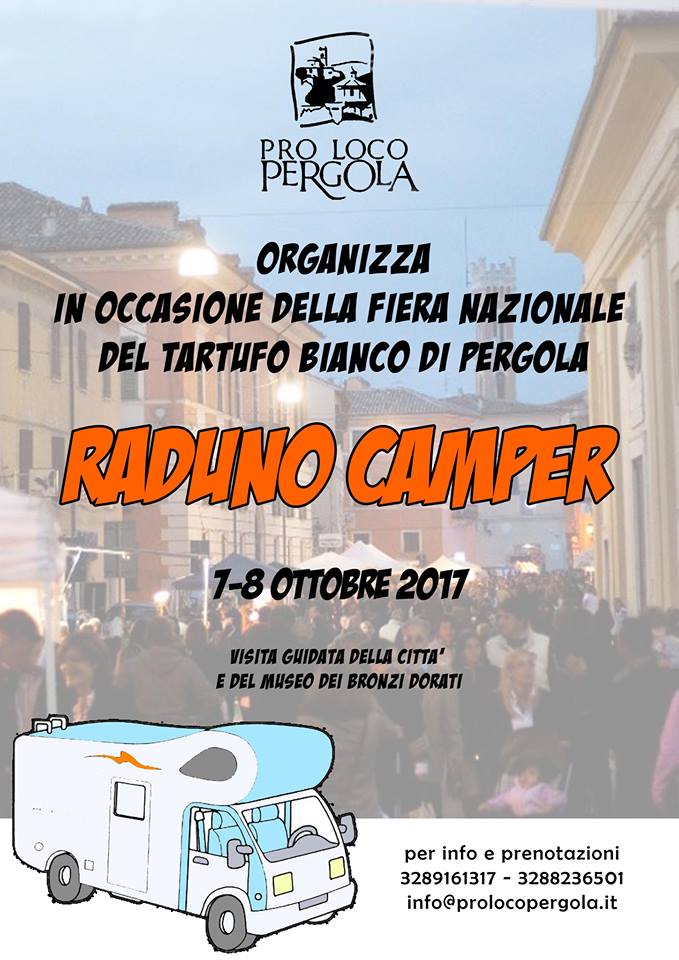 Chi ha deciso di partecipare al raduno camper è invitato a comunicare i propri dati alla mail info@prolocopergola.it o ai numeri 3289161317 (Paola) – 3288236501 (Patrizia), in modo da poter organizzare la meglio il raduno, possibilmente entro giovedì 5 Ottobre 2017.