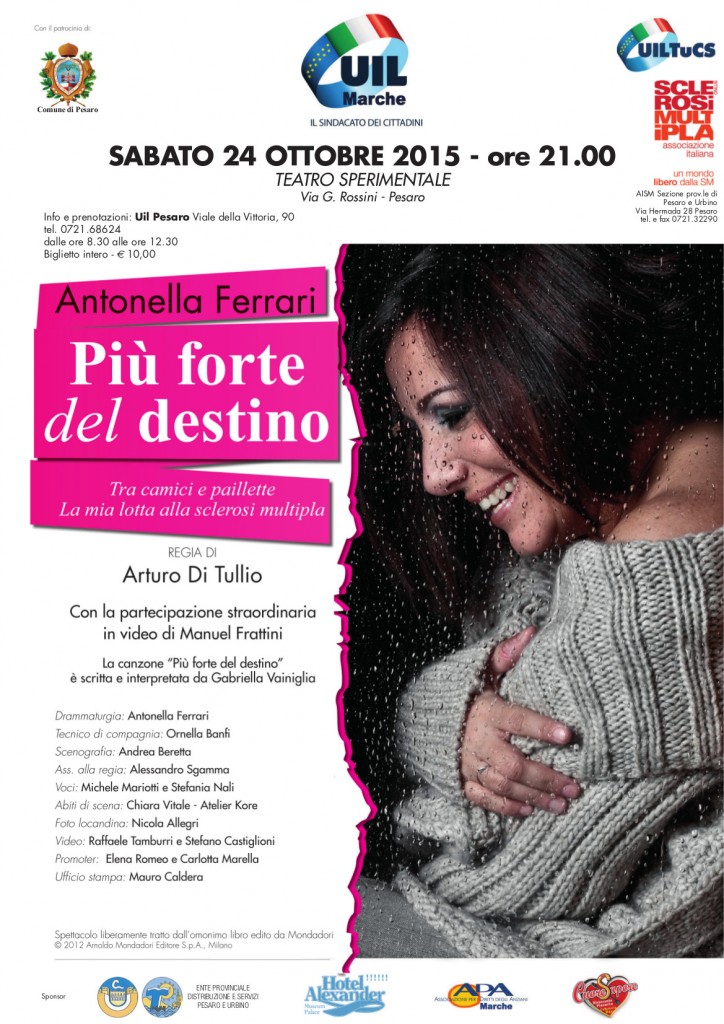 Reduce dal Sold out di Forlì, sabato 24 ottobre alle ore 21.00 al Teatro Sperimentale di Pesaro andrà in scena lo spettacolo “Più forte del destino – tra camici e pailette la mia lotta alla sclerosi multipla“, scritto e interpretato da Antonella Ferrari, autrice dell’omonimo libro, edito da Mondadori.