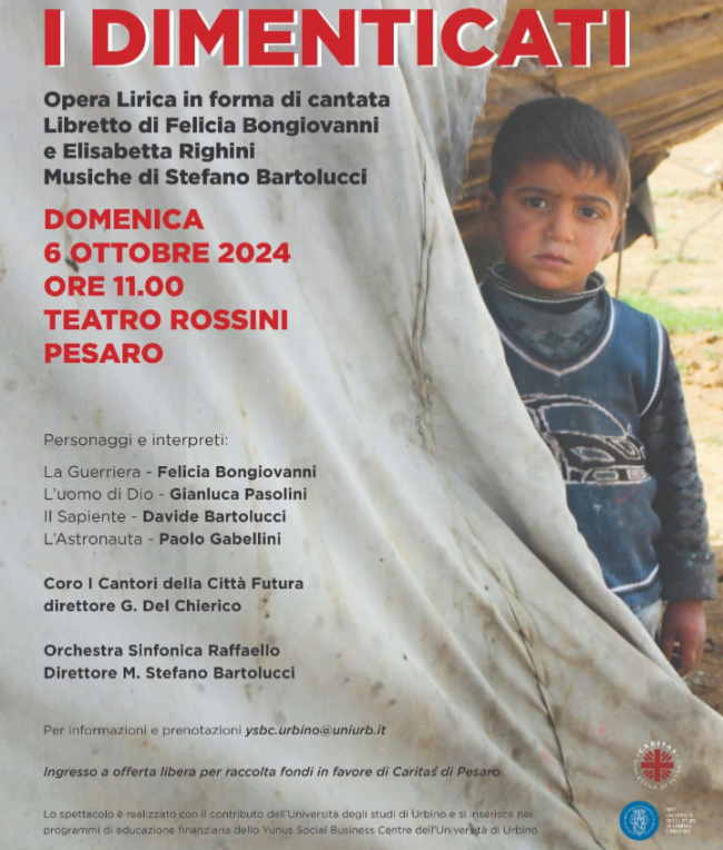 “I Dimenticati” è un’opera lirica in forma di cantata sul microcredito e il social business, come iniziativa di educazione finanziaria tramite la cultura e la musica, che tratta il tema, di stringente attualità e di grande rilevanza sociale, delle ineguaglianze socioeconomiche derivanti dalla globalizzazione economico-finanziaria e dallo sfruttamento iniquo delle persone e del pianeta. Questi fenomeni sono stati intensificati ed aggravati dalle crisi ambientali, sociali, economiche e belliche, che hanno messo in chiara luce i limiti e le falle del sistema socioeconomico globale. Lo strumento suggerito nell’opera per combattere e ridurre tali disfunzioni viene identificato nelle pratiche del Microcredito e del Social Business, quali strumenti di promozione umana e sociale, così come teorizzati e realizzati dalPremio Nobel per la Pace Muhammad Yunus.