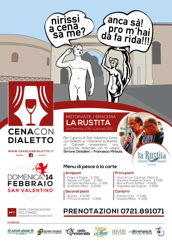 Sarà un San Valentino tutto da ridere quello organizzato al ristorante La Rustita di Calcinelli nell’ambito dell’iniziativa Cena con dialetto, le cene-spettacolo con intrattenimento dialettale sotto la direzione artistica di Nicola Anselmi.