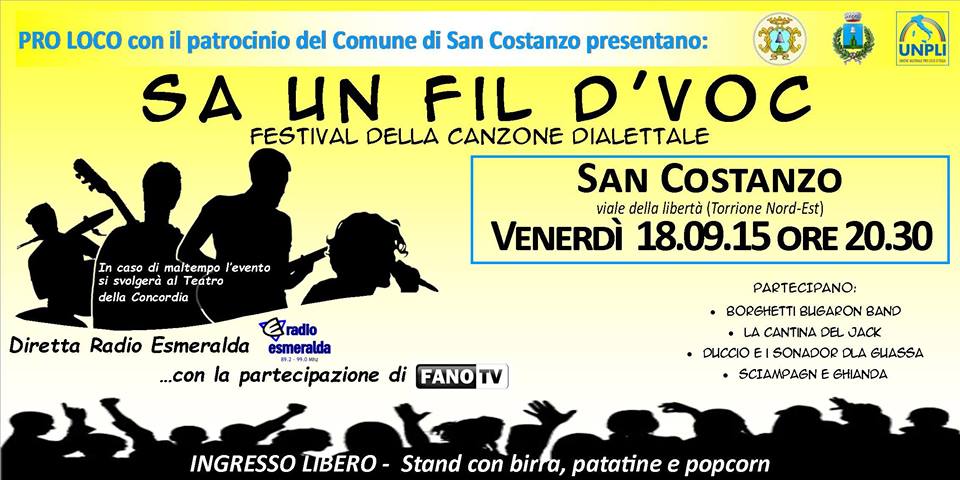 S’intitola “Sa un fil d’voc” la prima edizione del festival della canzone dialettale che si terrà venerdì sera lungo viale della Libertà (torrione nord est) a San Costanzo. Ad organizzare l’originale iniziativa la Pro Loco in collaborazione con l’amministrazione comunale e con il patrocinio dell’Unpli. “Apriamo ai giovani, attraverso la musica, il prezioso patrimonio dialettale, offrendo così un’occasione unica per riscoprire i valori delle tradizioni e delle musiche popolari. Riscoprire le “rajche”, radici, di un patrimonio antichissimo vivo e presente che distingue la cultura del nostro territorio é un’opportunità unica”, spiegano i promotori. Quattro le band che dalle 20.30 si esibiranno: “Borghetti bugaron band” di Fano, “La cantina del Jack” di Gallo di Petriano, “Duccio e i sonador dla guassa” di Urbino, “Sciampagn e ghianda” di Pieve di Cagna. “Saranno le vere protagoniste della musica dialettale, la lingua “nobile” che torna a farci vibrare di emozioni ed a farci divertire. Questo festival “popolare”, è la vita di tutti i giorni, è l’espressione di una passione che porta tante persone dietro il sipario per regalare un sorriso. È la nostra realtà. Ed è da applaudire”. La serata sarà in diretta su Radio Esmeralda. Per arricchire l’evento la presenza di due poeti dialettali. Walter e Paolo canteranno e reciteranno in versi alcune delle loro composizioni, alternandosi alle band musicali. L’ingresso è libero. Funzioneranno stand gastronomici con birra, patatine e popcorn. In caso di maltempo, la serata si svolgerà al teatro comunale della Concordia. L’ennesimo appuntamento di un’estate caratterizzata a San Costanzo da un calendario di eventi ricchissimo e che ha riscosso un ottimo successo di pubblico.
