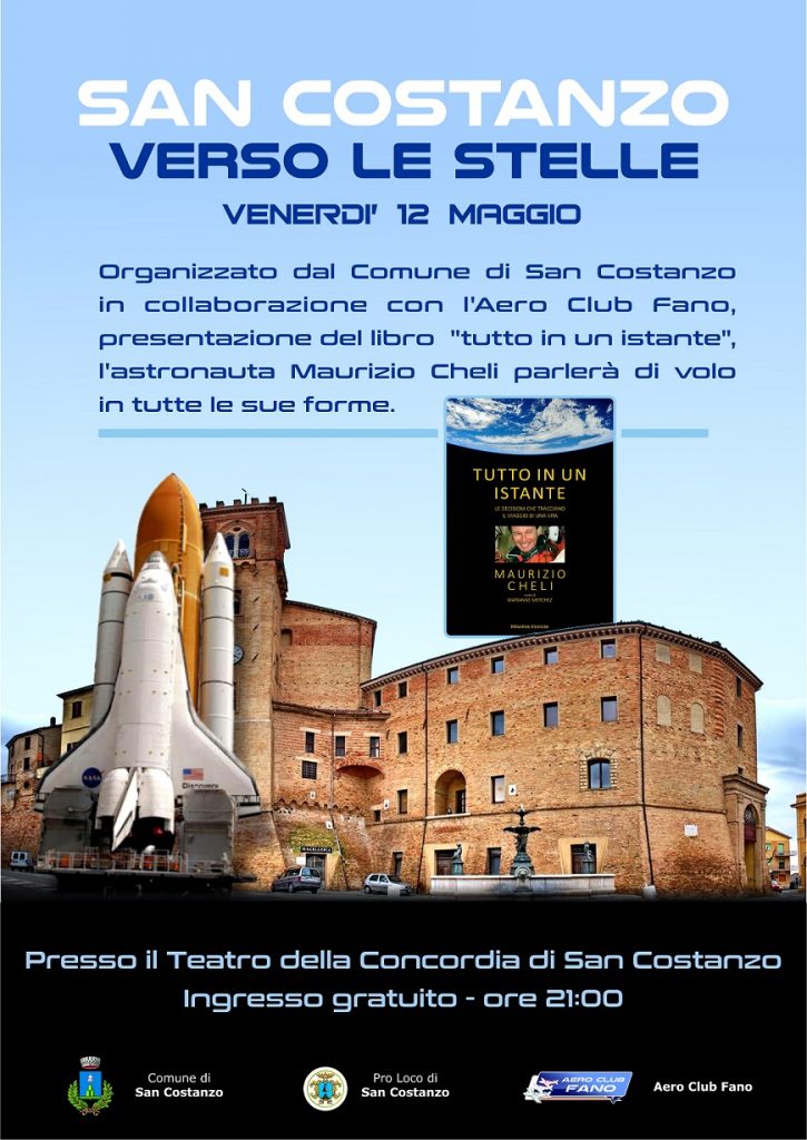 Grazie all’impegno dell’Aeroclub Fano e alla collaborazione del Comune di San Costanzo, Maurizio Cheli sarà il protagonista della serata “San Costanzo verso le stelle” che si terrà presso il Teatro della Concordia di San Costanzo, venerdì 12 maggio alle ore 21:00, quando incontrerà il pubblico per raccontare la sua straordinaria avventura raccolta nel libro “Tutto in un istante”, edizioni Minerva.