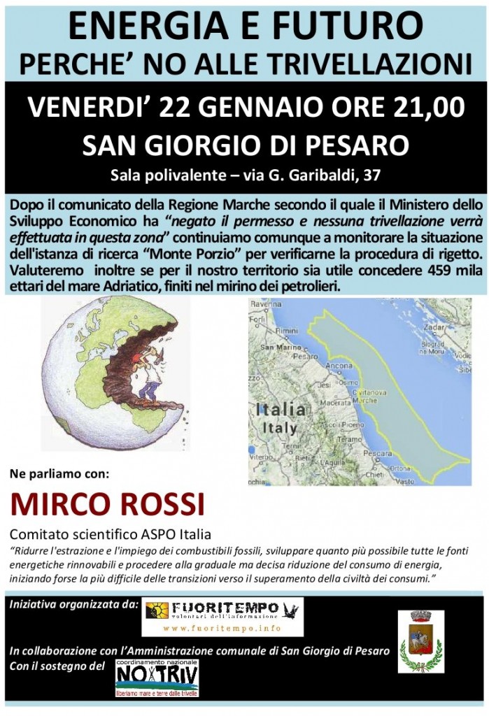 “Energia e futuro: perché no alle trivellazioni” è il titolo dell’incontro organizzato dal gruppo Fuoritempo in collaborazione con l’Amministrazione comunale di San Giorgio di Pesaro per Venerdì 22 gennaio 2016 nella Sala Polivalente di San Giorgio di Pesaro (via Garibaldi, 37) alle ore 21.00.