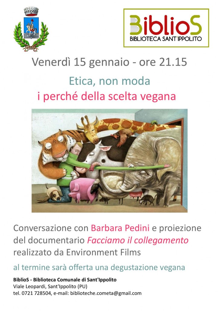 Una serata speciale alla BiblioS – Biblioteca Comunale di Sant’Ippolito interamente dedicata alla scelta vegana. Venerdì 15 gennaio alle ore 21.15 Barbara Pedini, esperta in materia, illustrerà storia e motivazioni alla base di una scelta alimentare sempre più consapevole e diffusa. Ultimamente infatti si assiste al proliferare di prodotti contrassegnati dalla scritta “vegan”, l’incontro vuole andare oltre quella che potrebbe sembrare la moda del momento e far capire davvero cosa spinge le persone a rinunciare ai prodotti di origine animale. Nel corso della serata verrà inoltre proiettato il documentario “Facciamo il collegamento”, realizzato da Environment Films per la Vegan Society inglese. Un documentario in cui vengono intervistate diverse persone: cuochi, atleti, mamme vegan, nutrizionisti, deputati, direttori e consulenti di un’azienda agricola senza animali, ambientalisti, ricercatori, autori e poeti. Attraverso tali interviste, vengono spiegate innanzitutto le ragioni della scelta vegan, e poi come da questa scelta tutti ci guadagnino. Una carrellata di esempi davvero efficace per mostrare la realtà della vita vegan ed i suoi innumerevoli aspetti positivi, sia nella vita personale di tutti i giorni, sia per il mondo intero, la natura, gli animali e le persone che ci vivono. Al termine della serata saranno offerti ai presenti alcuni assaggi di prodotti vegan. Vi aspettiamo!