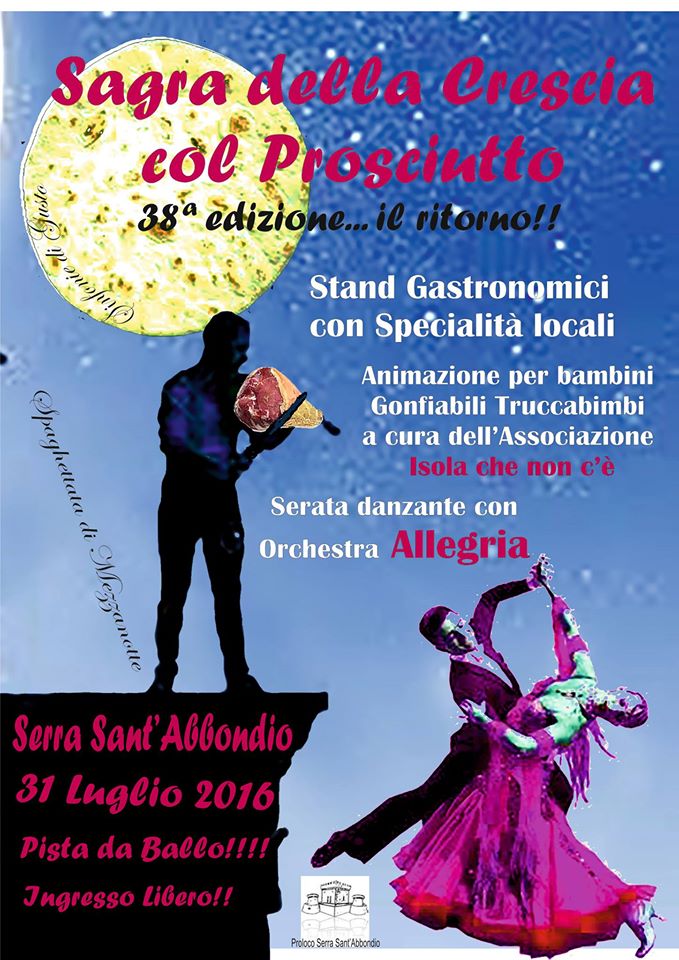 Torna il 31 luglio la Sagra della Crescia col Prosciutto, organizzata dalla Pro Loco, e subito si ripresenta con musica, allegria, Cibi tipici e l’immancabile crescia fatta a mano dalle donne serrane.