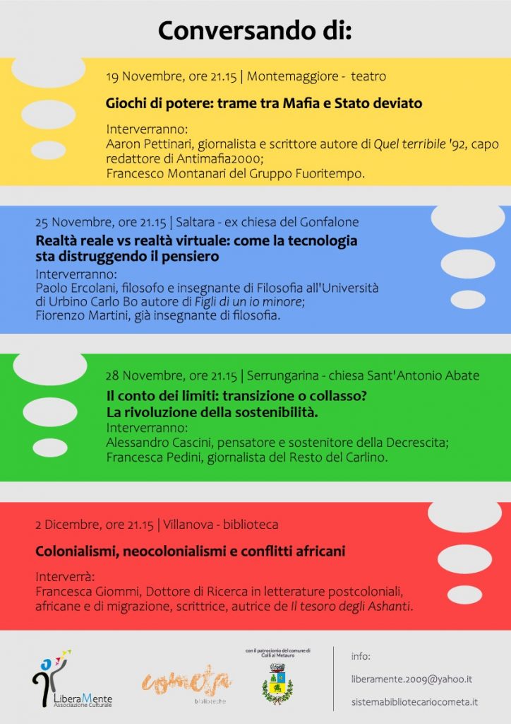 Terzo appuntamento della rassegna “Conversando di” giovedì 28 Novembre alle 21.15, a Serrungarina nella chiesa di Sant’Antonio Abate, con l’incontro “Il conto dei limiti: transizione o collasso? La rivoluzione della sostenibilità”.