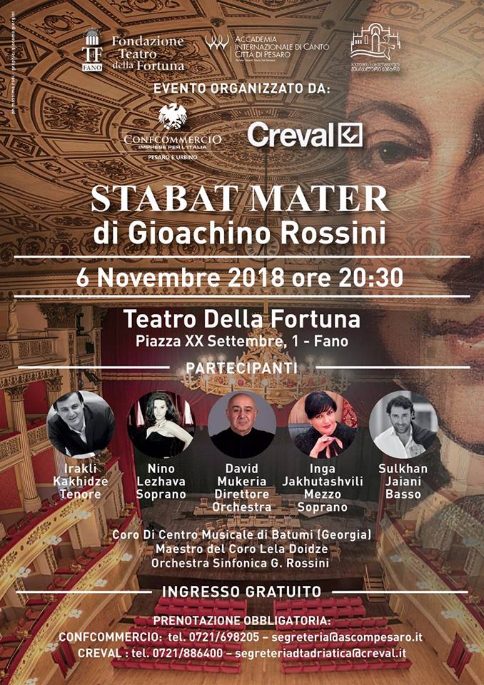 Martedì 6 novembre alle ore 20.30 al Teatro della Fortuna di Fano si terrà il Concerto STABAT MATER di Gioachino Rossini. Ospiti della serata l’Orchestra Sinfonica G. Rossini di Pesaro, il Coro del Centro Musicale di Batumi in Georgia, il Soprano Nino Lezhava ed il tenore, il basso e la mezzosoprano provenienti dalla Scuola di Musica di Batumi.