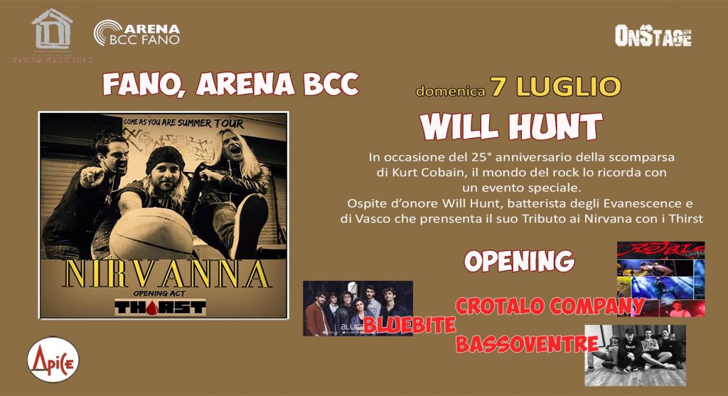 Domenica 7 Luglio a Fano, l’Area BCC sarà il teatro di uno speciale evento, esclusivo per la città di Fano: Will Hunt con la sua band, i Thirst, presentano “Nirvanna” tributo ai Nirvana per ricordare Kurt Cobain nel venticinquesimo anno dalla sua morte.