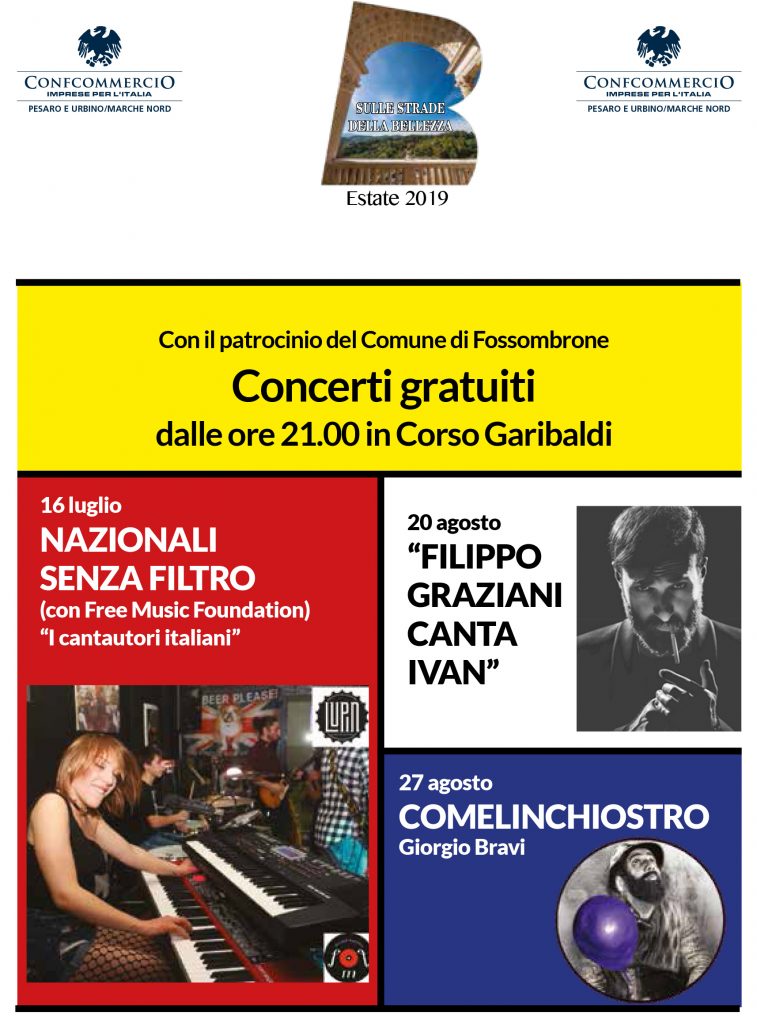 Sul palco di Piazza Garibaldi dalle ore 21,00 si esibirà il gruppo pesarese “Nazionali senza Filtro” con Free Music Foundation e guidato da Linda Centini, con un repertorio che spazierà nella musica dei cantautori italiani.