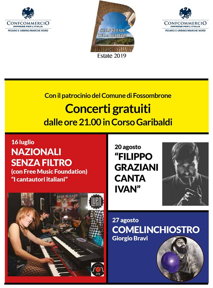 La serata rientra nella rassegna di concerti e spettacoli che arricchiscono l’estate di quattro comuni (Gabicce Mare, Mondavio, Fossombrone, Sant’Angelo in Vado)che aderiscono al progetto Confcommercio Pesaro e Urbino/Marche Nord “L’Itinerario della Bellezza”.
