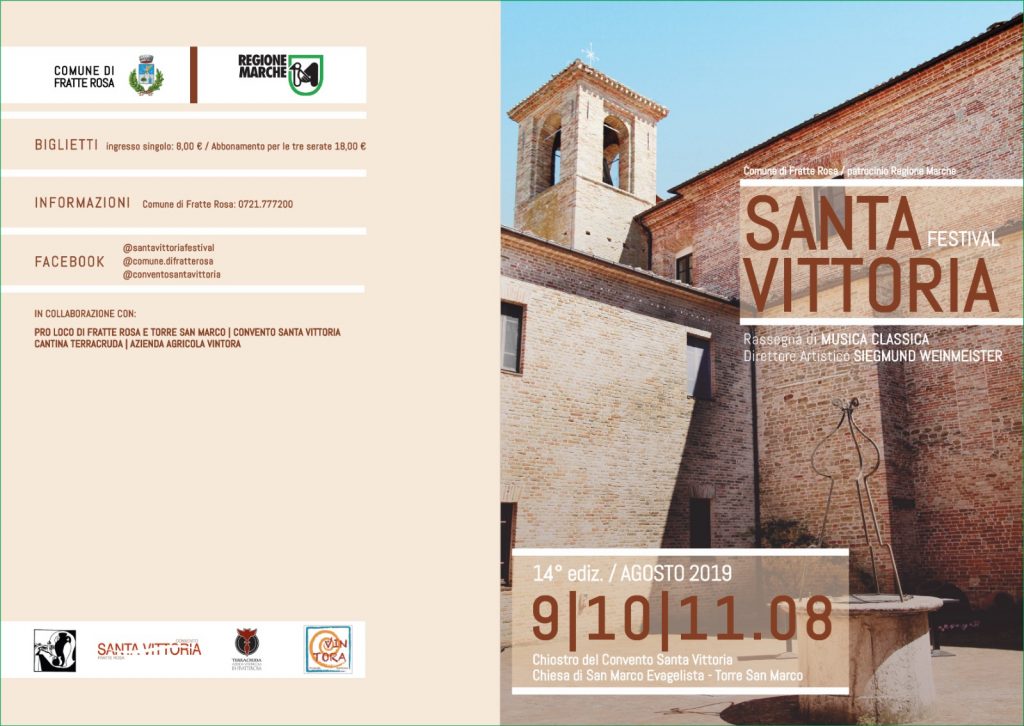 Il Santa Vittoria Festival, giunto quest’anno alla quattordicesima edizione, è una rassegna di musica classica inserita nel più grande progetto di valorizzazione del Convento di Santa Vittoria, che ha nella presentazione di eventi culturali di alta qualità uno dei suoi punti di forza. Il Convento si trova nel piccolo comune di Fratte Rosa (980 abitanti), ed è la struttura di maggior pregio storico ed architettonico. Il complesso architettonico monumentale di Santa Vittoria sorge isolato, in posizione dominante su un pianoro che costituisce lo spartiacque tra il Metauro e il Cesano, a poca distanza dal centro storico di Fratte Rosa. Una scritta posta sull’arco di entrata del Convento ne ricorda l’anno di fondazione e di restauro: “Anno Fundationis 1216 – Restaurationis 1773”. La fondazione del Convento viene fatta risalire allo stesso San Francesco; infatti il francescanesimo, nato in Umbria, trovò nelle Marche un clima adatto: lungo i tre fiumi Cesano, Metauro e Foglia sorgono diversi conventi indicati come francescani quali quelli di Mondavio, Fratte Rosa e Saltara. La chiesa del convento probabilmente era sorta prima dell’XI secolo perché qui passava un asse viario trasversale che in età romana univa Aesis (Jesi) a Forum Sempronii (Fossombrone), attraverso Suasa e Ostra, realizzando un collegamento tra il diverticolo della via Salaria, che con il nome di Salaria Gallica giungeva fino ad Jesi e la via Flaminia. Il Convento di Santa Vittoria è celebre per aver ospitato San Carlo Borromeo nel 1579 nel suo pellegrinaggio alla S. Casa di Loreto. In questo periodo, esattamente nel 1657, durante il trasferimento dei Cappuccini di Fossombrone ai conventuali di Osimo fu visitato da San Giuseppe da Copertino. Troviamo all’interno della Chiesa del Convento una pala di Gianbattista Ragazzini raffigurante una “deposizione” (sec. XVI) (in corso di restauro) e una tela del pergolese Pietro Antonio Ugolini raffigurante la “Divina Pastora” (1773). I concerti si tengono all’interno del Convento, nel chiostro, che regala una atmosfera suggestiva agli spettatori, “schiacciati” tra le mura francescane ed il “tetto” di stelle del cielo.