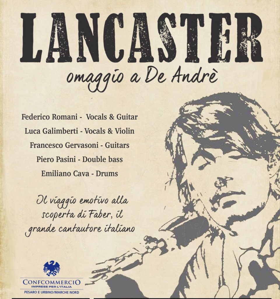 Giovedì 25 luglio dalle ore 21,00 si esibirà sul palco il gruppo Lancaster, un quintetto nato per omaggiare Fabrizio de André, che propone personali arrangiamenti dei più grandi successi dell’artista genovese, con molto rispetto verso gli originali, trovando il proprio punto di forza nell’intimità dello spettacolo e delle sonorità proposte, grazie anche alla varietà di strumenti utilizzati.