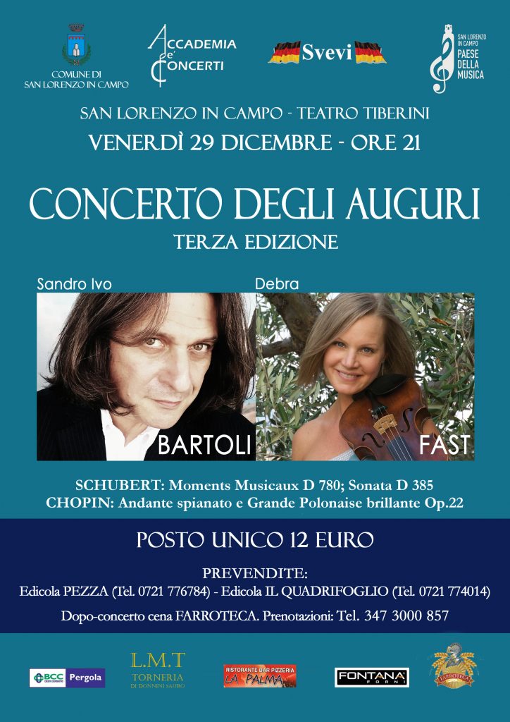 Torna il Concerto degli Auguri, l’ormai tradizionale appuntamento con la musica classica che Accademia de’ Concerti organizza al Teatro Tiberini di San Lorenzo con la partecipazione del Comune di San Lorenzo in Campo. Venerdì 29 dicembre alle 21, il celebre pianista Sandro Ivo Bartoli, reduce da una fortunata apparizione televisiva sugli schermi di Canale 5 ospite di Barbara Palombelli dove lo hanno ascoltato milioni di telespettatori, proporrà un programma dedicato al genio romantico con musiche di Schubert e Chopin. A coadiuvarlo, nell’esecuzione della Sonata in la minore D 385 di Franz Schubert, ci sarà la violinista canadese Debra Fast, compagna del maestro sul palco e nella vita (i due musicisti, sposati da anni, sono da poco rientrati da una trionfale tournée del Giappone). “Torno sempre volentieri a San Lorenzo in Campo, un luogo dove ho trovato tanti amici e uno splendido teatrino – dice il pianista – e sia a me che a mia moglie fa molto piacere finire l’anno qui”. Il pubblico di San Lorenzo conosce bene Bartoli e la Fast, i quali, tra l’altro, lo scorso giugno hanno realizzato il Bianchi e Neri Piano Fest Laurentino, rassegna di tre concerti a tema che ha riscosso l’unanime plauso del pubblico e della critica. Oltre alla sonata per violino e pianoforte di Schubert il programma prevede l’esecuzione dei deliziosi Moments Musicaux D 780 del medesimo autore e il celeberrimo Andante Spianato e Grande Polonaise Brillante Op.22 di Frédéryk Chopin. “È musica bellissima – continua il maestro – che si focalizza sul turbinio di passioni e sentimenti caratteristico del primo periodo Romantico. Se Schubert ne rappresenta la parte più intima e struggente, specialmente con i Moments Musicaux che sono una vera e propria storia narrata in musica, il brano di Chopin manifesta l’ardore focoso del giovane virtuoso in cerca di fortuna, dove non mancano slanci di difficoltà luciferine. È un programma a tinte forti, che dovrebbe far nascere emozioni profonde in chi suona e in chi ascolta. Questa, almeno, è la nostra intenzione!”