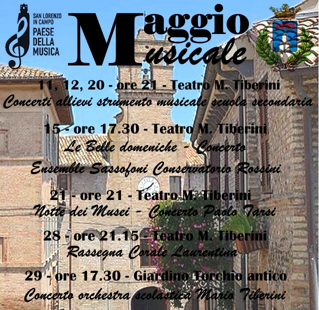 Un “Maggio musicale”, tra saggi, concerti e rassegne propone San Lorenzo in Campo, sempre più Paese della Musica. Eventi di qualità, promossi dall’Amministrazione comunale in collaborazione con associazioni e l’istituto comprensivo, che ancora una volta evidenziano tutte le enormi potenzialità del centro laurentino in campo musicale.