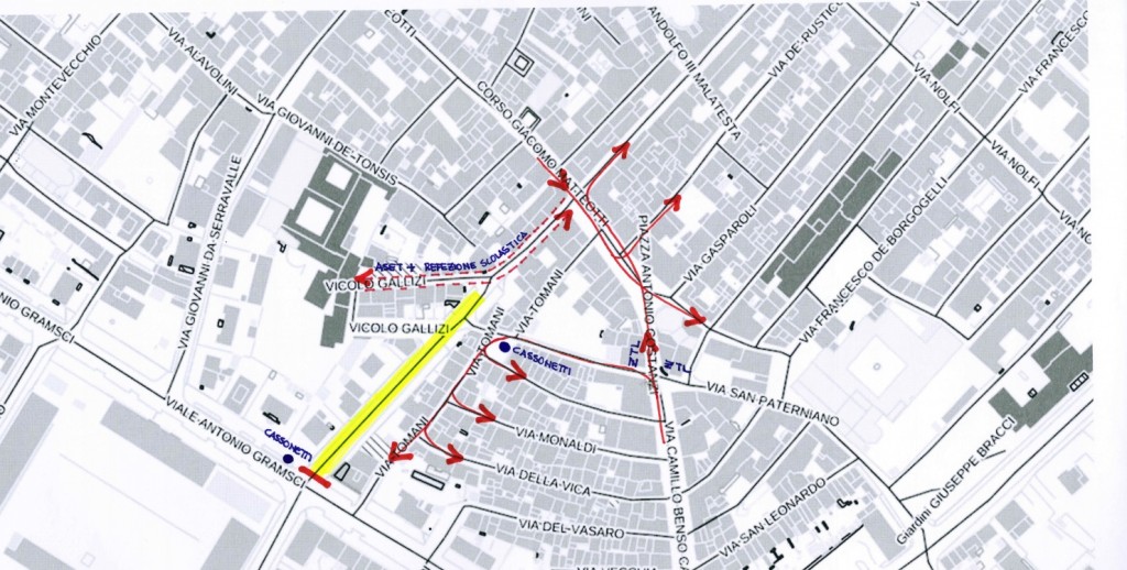 Pertanto il tratto di via Garibaldi, lato ovest, sarà chiuso temporaneamente al transito carrabile per tutta la durata dei lavori. Per raggiungere piazza Costanzi si potrà accedere da via Cavour e proseguire in via Garibaldi lato est. Piazza Costanzi sarà a doppio senso per consentire l’uscita dal centro storico; le auto che vengono da via Garibaldi (lato est, cioè dal lato dove si trova l’ufficio delle Poste Italiane) e da Corso Matteotti potranno uscire passando per via Bovio oppure per via De Rusticucci.