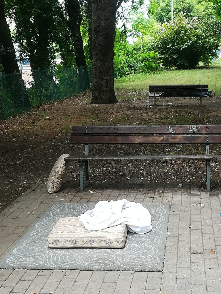 Come dicevamo, nei Passeggi si trovano materassi a terra dove dormono senza tetto e con frequentazioni di individui che dal mattino presto consumano alcool lasciando bottiglie in giro, una scarsa pulizia e una generale mancanza di manutenzione nelle panchine rimaste agibili.