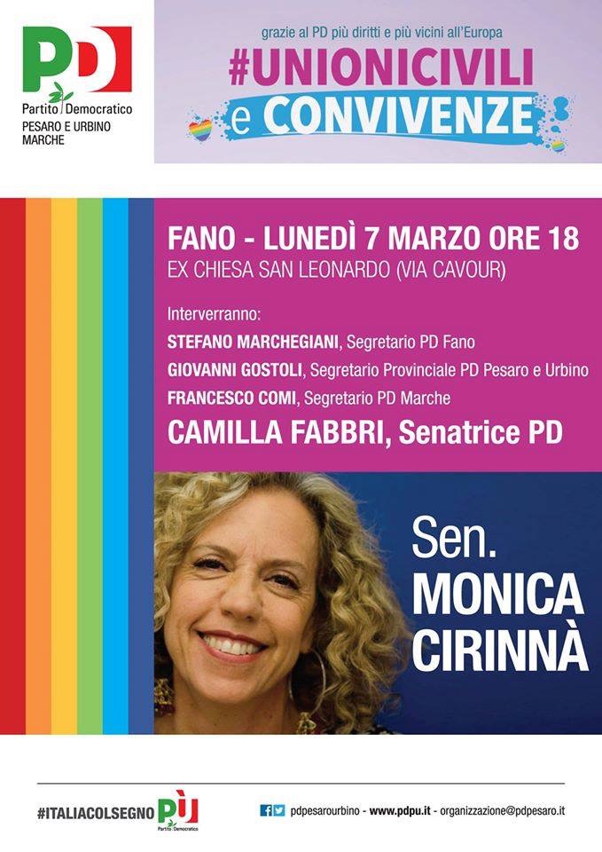 Si terrà a Fano, lunedì 7 marzo, alle ore 18, presso la ex chiesa San Leonardo, in via Cavour, l’iniziativa dedicata al disegno di legge che regolamenta le unioni civili e le convivenze. L’appuntamento, promosso dal Partito Democratico, vedrà la partecipazione della sen. Monica Cirinnà; della sen. Camilla Fabbri; del Segretario Pd Marche, Francesco Comi; del Segretario Provinciale Pd Pesaro Urbino, Giovanni Gostoli; del Segretario Pd Fano, Stefano Marchegiani.