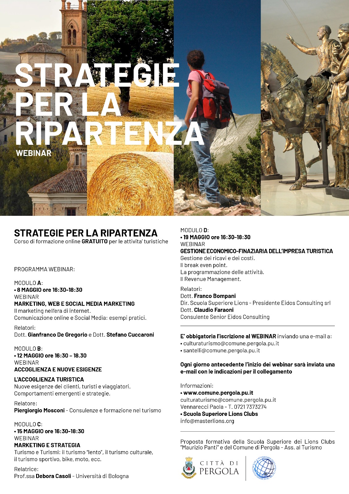 Come e cosa cambierà? Cosa possiamo fare? Cosa sappiamo già fare per rispondere alle nuove esigenze? Il corso, la cui proposta formativa è curata dalla Scuola Superiore dei Lions Club “Maurizio Panti”, direttore il pergolese Franco Bompani, pone particolare attenzione al turismo e ai suoi diversi tipi, alla gestione economico-finanziaria delle strutture, a come accogliere e cogliere le nuove esigenze, con una introduzione importante sulla Comunicazione, al Web Marketing e ai Social Media, dei quali in questo periodo di quarantena abbiamo potuto notare tutta la loro efficacia e potenza. Comunque anche se i contenuti del corso, sono orientati principalmente al settore della ricettività e del turismo sono validi ed utili per qualsiasi settore. Inoltre una seconda tappa del percorso di sostegno alle imprese del territorio è quello relativo al mondo della Finanza agevolata , per questo metteremo presto a disposizione un corso dedicato a questa tematica organizzato e tenuto dai professionisti di Svim Sviluppo Marche srl che si occupa dell’assistenza tecnica, della rendicontazione e della gestione delle misure del POR FESR 2014-2020 della Regione Marche”.