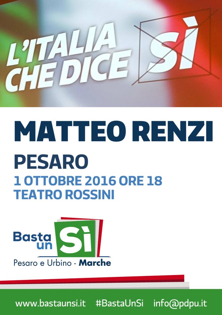 Già dalle 17.30 si potrà accedere al Teatro. E’ prevista una bella partecipazione di tante persone che desiderano ascoltare le parole di Matteo Renzi per capire il merito della Riforma Costituzionale e quanto sia davvero importante esprimere un “Si” al referendum. E’ quasi tutto pronto per quella che sarà l’iniziativa di apertura per la campagna elettorale al prossimo referendum previsto il 4 dicembre. Tanti i volontari che hanno assicurato la disponibilità per l’organizzazione e l’accoglienza nello splendido scenario del teatro Rossini, alcuni dei quali racconteranno la manifestazione su twitter e facebook a colpi di hashtag #BastaUnSi e #Pesaro
