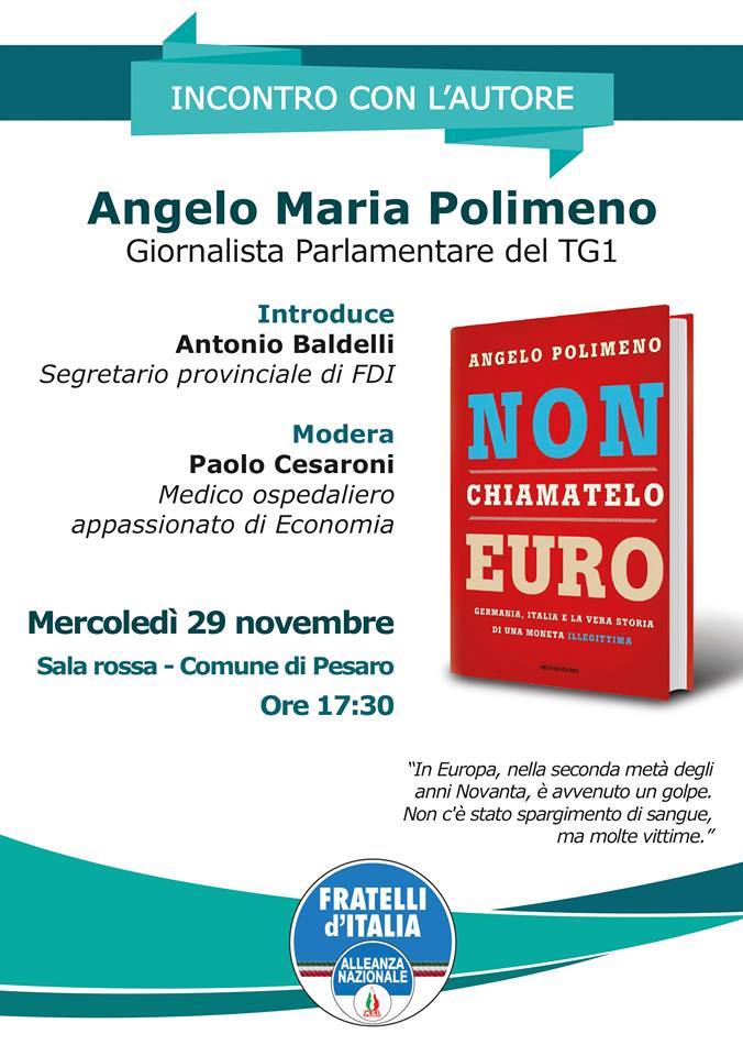 Il Coordinamento Provinciale di Fratelli d’Italia organizza questo mercoledì pomeriggio a Pesaro, alle ore 17:30 presso la Sala Rossa del Palazzo Comunale, un interessante dibattito sull’euro insieme a Angelo Polimeno, giornalista Parlamentare del tg 1, che nell’occasione presenterà il suo libro “non chiamatelo Euro”. Un libro che rappresenta un’autorevole e interessante riflessione sui trattati Europei ed il loro rapporto con la Costituzione Italiana, la sovranità Popolare e la Libertà dei Popoli Europei. Introdurrà l’autore Antonio Baldelli, avvocato e segretario provinciale di Fratelli d’Italia, modererà l’incontro Paolo Cesaroni, medico ospedaliero è appassionato di economia. Il libro di Polimeno che ha fatto già molto scalpore e che compie una approfondita analisi della normativa europea narra di come “in Europa, nella seconda metà degli anni Novanta, è avvenuto un golpe. Non c’è stato spargimento di sangue ma molte vittime”. tutti i cittadini interessati all’argomento sono invitati a partecipare.