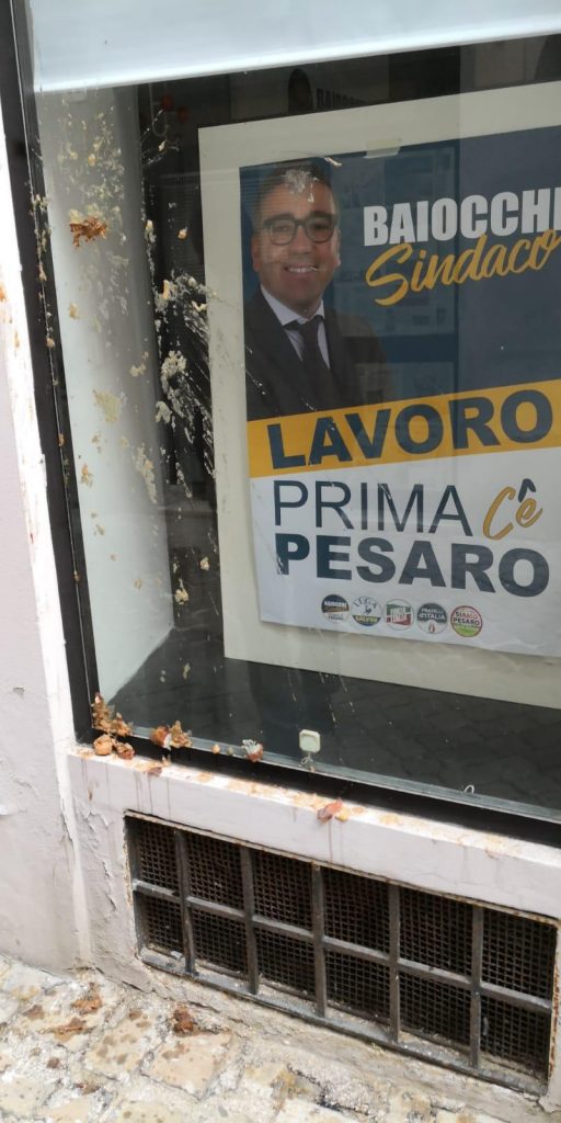 Questa mattina la sede del comitato elettorale del candidato sindaco di Pesaro, Nicola Baiocchi, è stata oggetto di atti di vandalismo: imbrattamento di finestre e muri con delle uova e oggetti di dubbia provenienza abbandonati vicino all’ingresso. Un atto di vandalismo non indifferente che ha lasciato senza parole i membri del partito e i passanti.