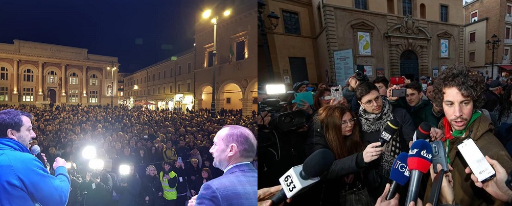 Matteo Salvini, leader della Lega in piazza del Popolo, Mattia Santori, leader delle Sardine, a piazzale Lazzarini, 450 metri più in là. Giornata politica intensa ieri a Pesaro.