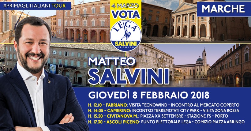 Matteo Salvini sarà in tour nelle Marche dopodomani, giovedì 8 febbraio.