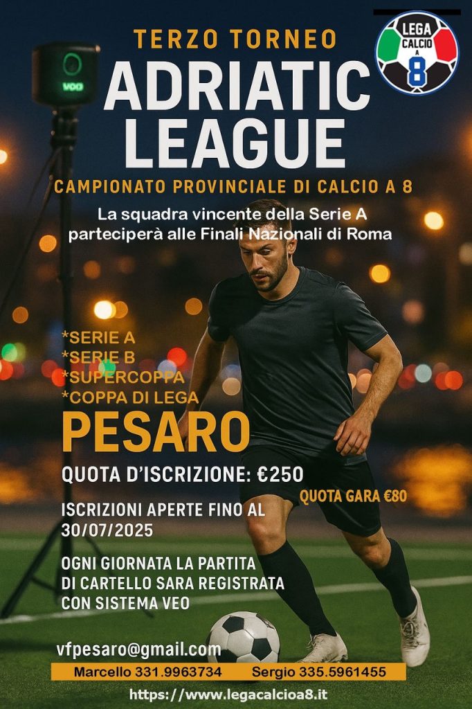Lo spettacolo del calcio a 8 torna protagonista sulla riviera adriatica. Settembre segna infatti l’avvio della terza edizione dell’Adriatic League, il torneo organizzato da ASD VF Adriatico in collaborazione con ASI Pesaro Urbino, che da settembre a maggio vedrà sfidarsi sul campo decine di squadre e oltre 500 atleti.