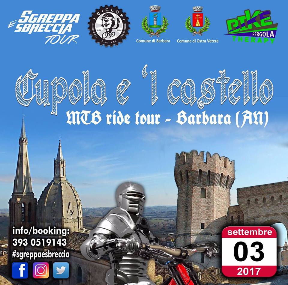 Domenica 3 settembre, Bike Therapy, Energia Barbara Asd e I Ciclopi organizzano la prima edizione della “CUPOLA E ‘L CASTELLO”: cicloturistica in mountain bike, quarta tappa del circuito “Sbreccia&Sgreppa”. La manifestazione escursionistica non è competitiva e si sviluppa all’interno del territorio dei comuni di Barbara e Ostra Vetere, in provincia di Ancona, su strade prevalentemente sterrate e antichi sentieri campestri.