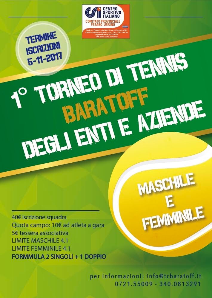 Il Csi Pesaro Urbino è in piena attività per organizzare la prima edizione del torneo di tennis Baratoff degli enti e aziende. C’è tempo fino al 5 novembre per iscriversi alla competizione che prevede sia la partecipazione maschile che femminile.